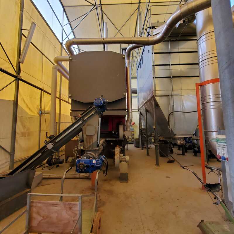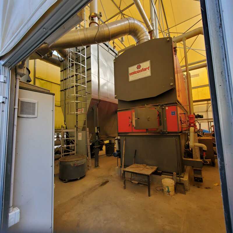 Caldaia a biomassa Uniconfort EOS 250, anno 2015 (kw.rese 2990), progettata per la combustione di materiale secco fino al 35% di umidità tramite carico a coclea, garantendo un funzionamento continuo e affidabile anche in contesti produttivi di grande scala. Completa di vaso di accumulo da 50.000 litri, carico del cippato tramite redler e batteria filtrante per i fumi, assicura efficienza energetica, gestione ottimale del combustibile e riduzione delle emissioni.