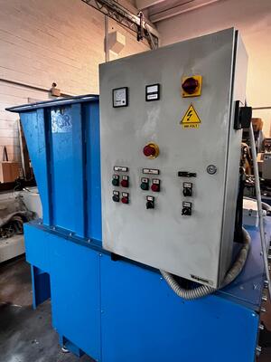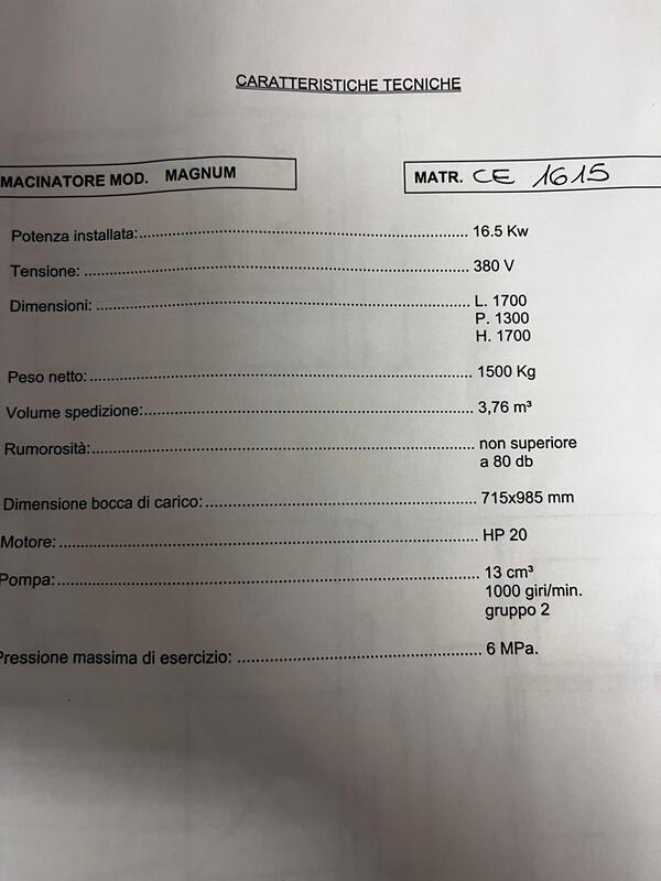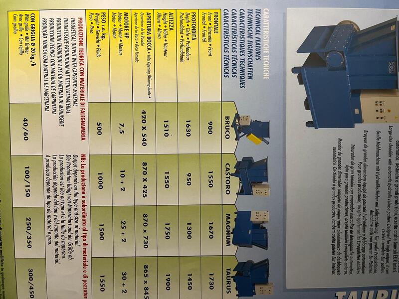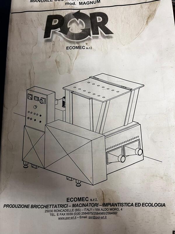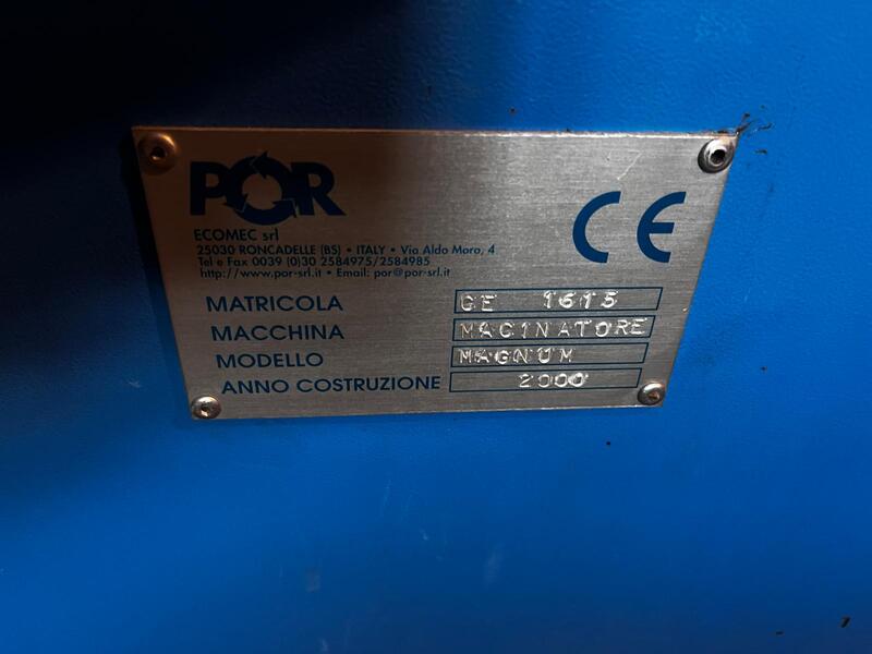 Macinatore P.O.R. modello Magnum, completo di coltellino a 4 facce e spintore, progettato per la frantumazione efficiente di scarti di legno e materiali simili. La macchina garantisce la frantumazione in cippato idoneo alla preparazione per eventuale produzioni di pellet o per alimentare impianti per il trattamento del legno.