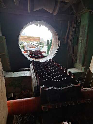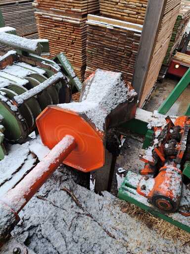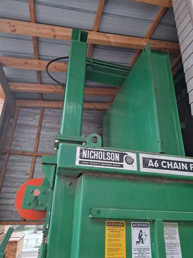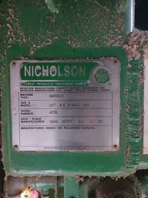Scortecciatore a tunnel Nicholson, anno 1996, con passaggio tronchi di 900 mm e 4 coltelli per rimuovere la corteccia in modo efficace. Lunghezza minima dei tronchi lavorabili: 1 m, velocità di avanzamento 15 m/min, motore da 45 kW.